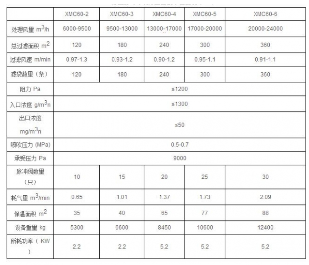xmc脈沖布袋除塵器型號技術參數: