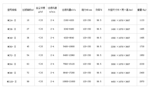 MC型脈沖布袋除塵器的型號參數: